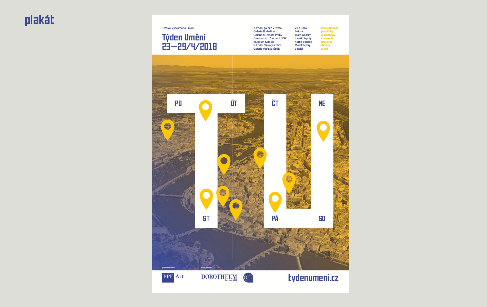 Navrhl jsem kompletní vizuální identitu festivalu Týden umění. První ročník se uskutečnil v dubnu 2018. Do programu festivalu se zapojily přes tři desítky muzeí, galerií a dalších institucí, které si dohromady připravily více než stovku akcí nejrůznějšího charakteru.